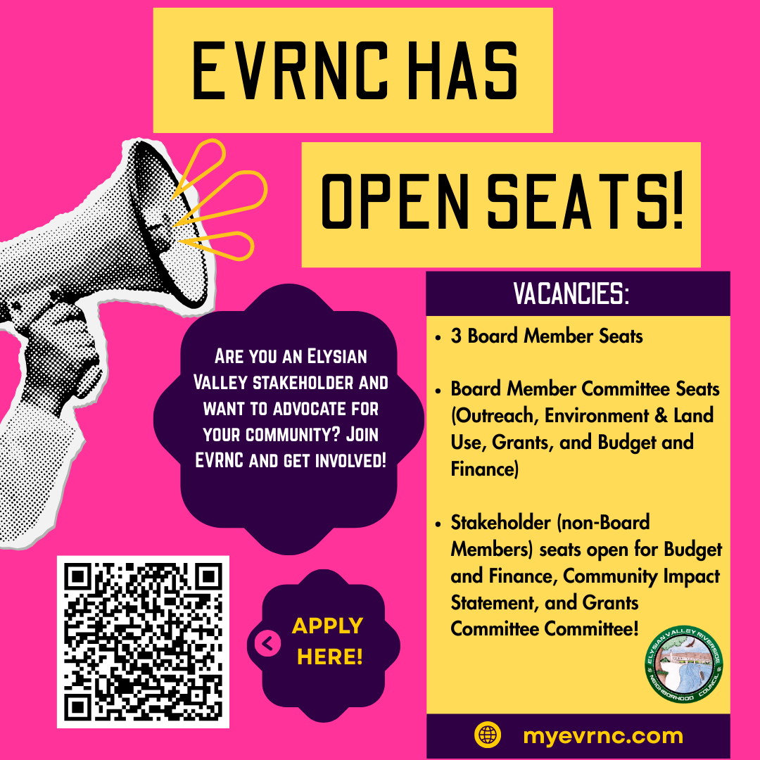 Attention Elysian Valley stakeholders: EVRNC has open board member and committee seats! Come advocate for your community and get involved. Apply here. Committee vacancies can be found on committee pages and board vacancies are always updated here.