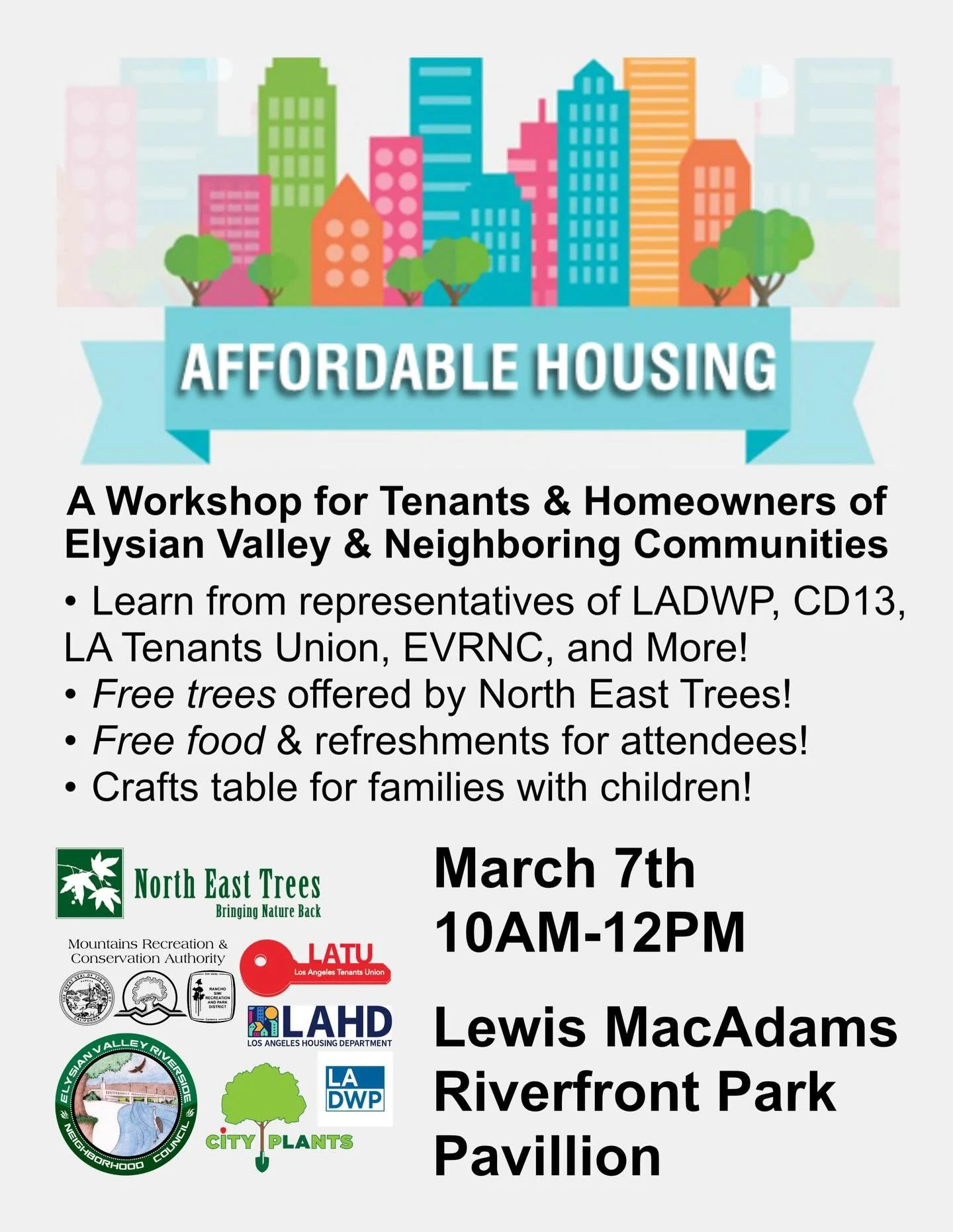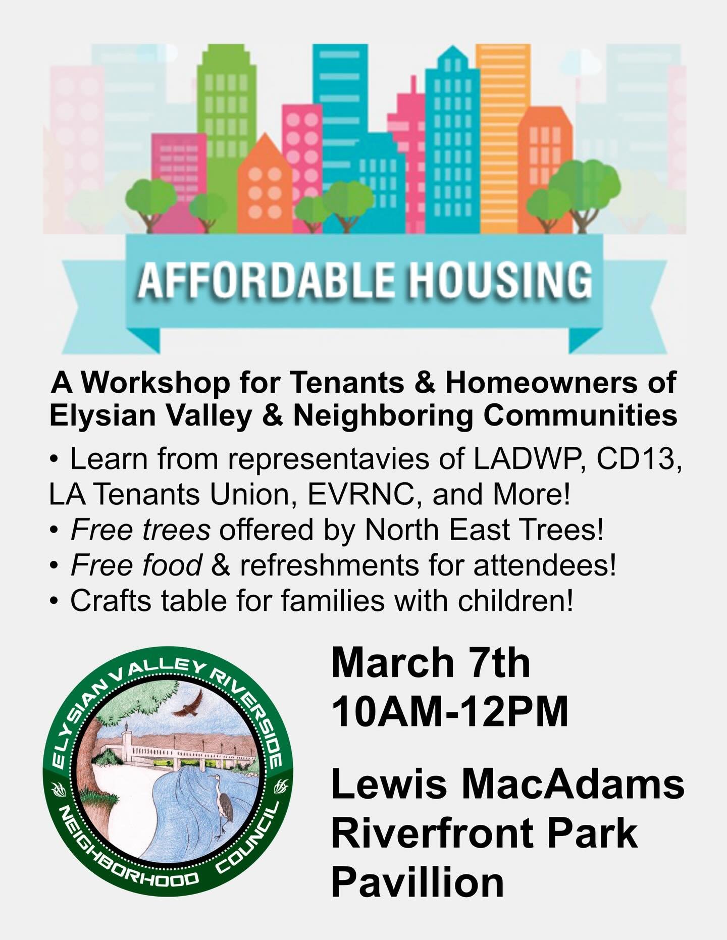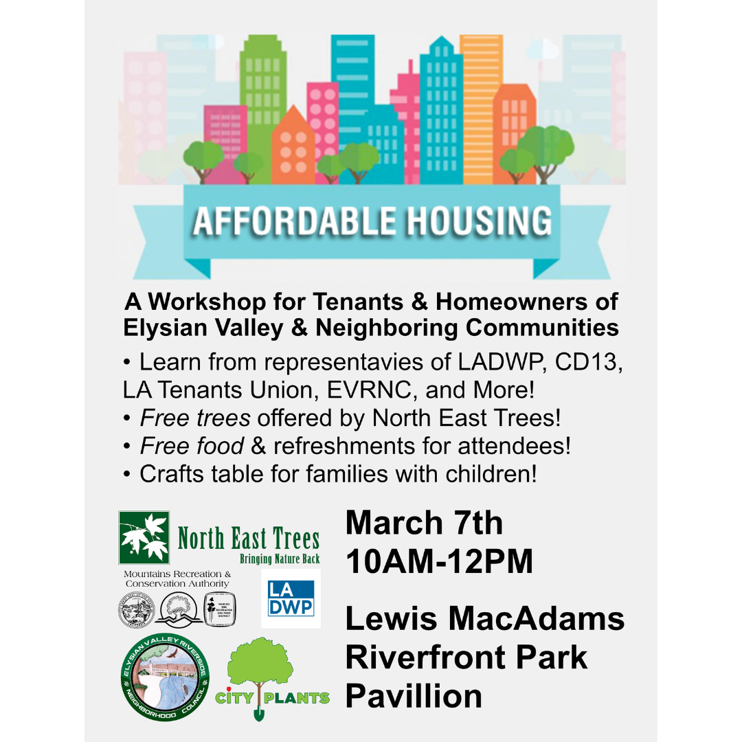EVRNC Environment and Land Use Committee invites you to a housing workshop for tenants and homeowners on March 7th from 10am-12pm at Lewis MacAdams Riverfront Park at the pavilion. Learn from representatives from LADWP, LATU, DONE, CD13, and more. Free trees provided by North East Trees, and there will be free food and drinks!