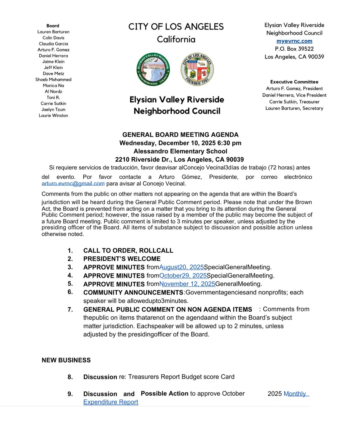 We want to hear from you! Is there a topic concerning Elysian Valley that you want to bring to the council’s attention? Members of the public can comment on non-agenda items during “Public Comment” and are able to comment on each agenda item.
