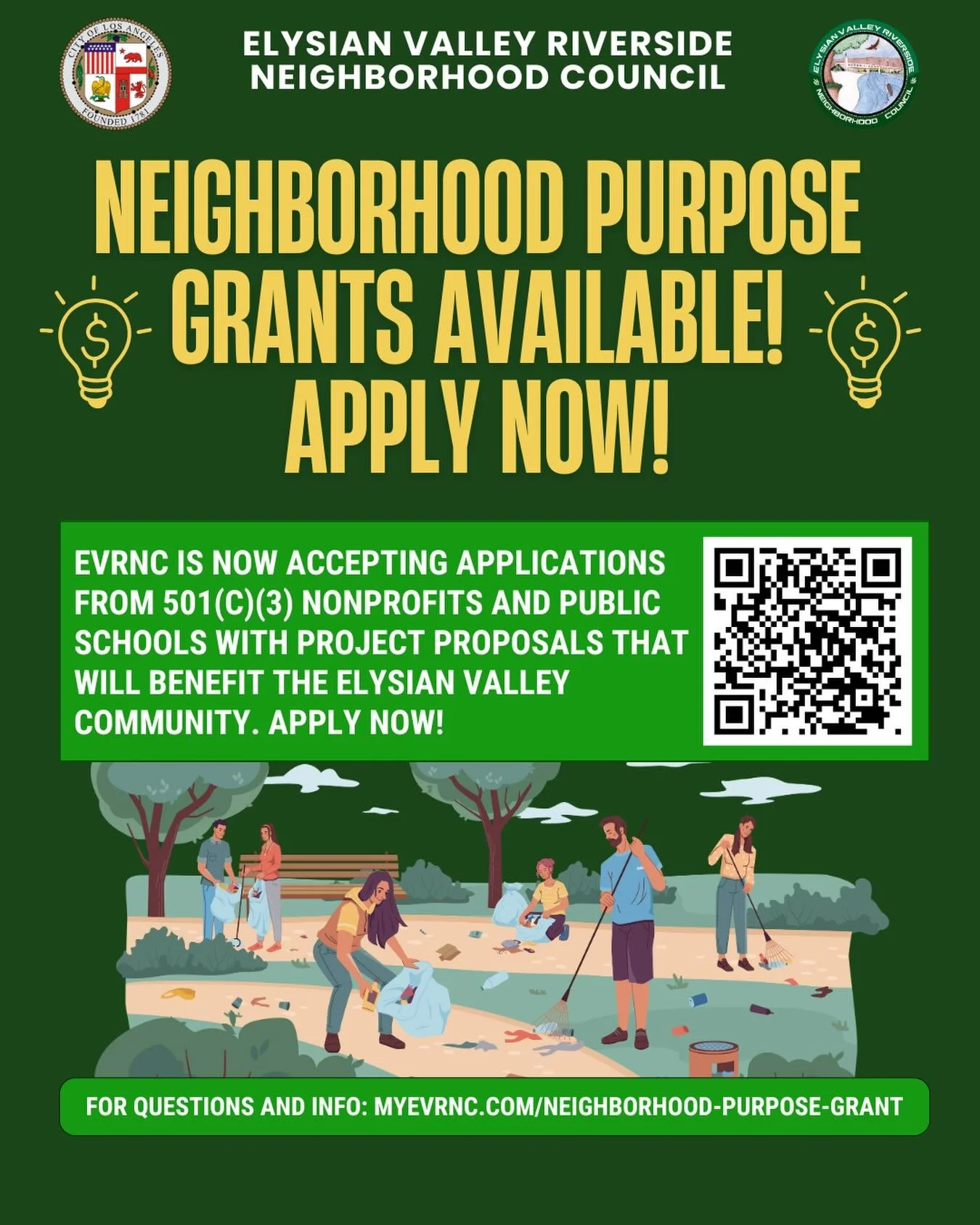 EVRNC has grants available! Are you with a local 501(c)(3) nonprofit or public school and have a project proposal that would benefit the Elysian Valley Community? The EVRNC Grants Committee is accepting NPG applications now! Find more info and how to apply here.