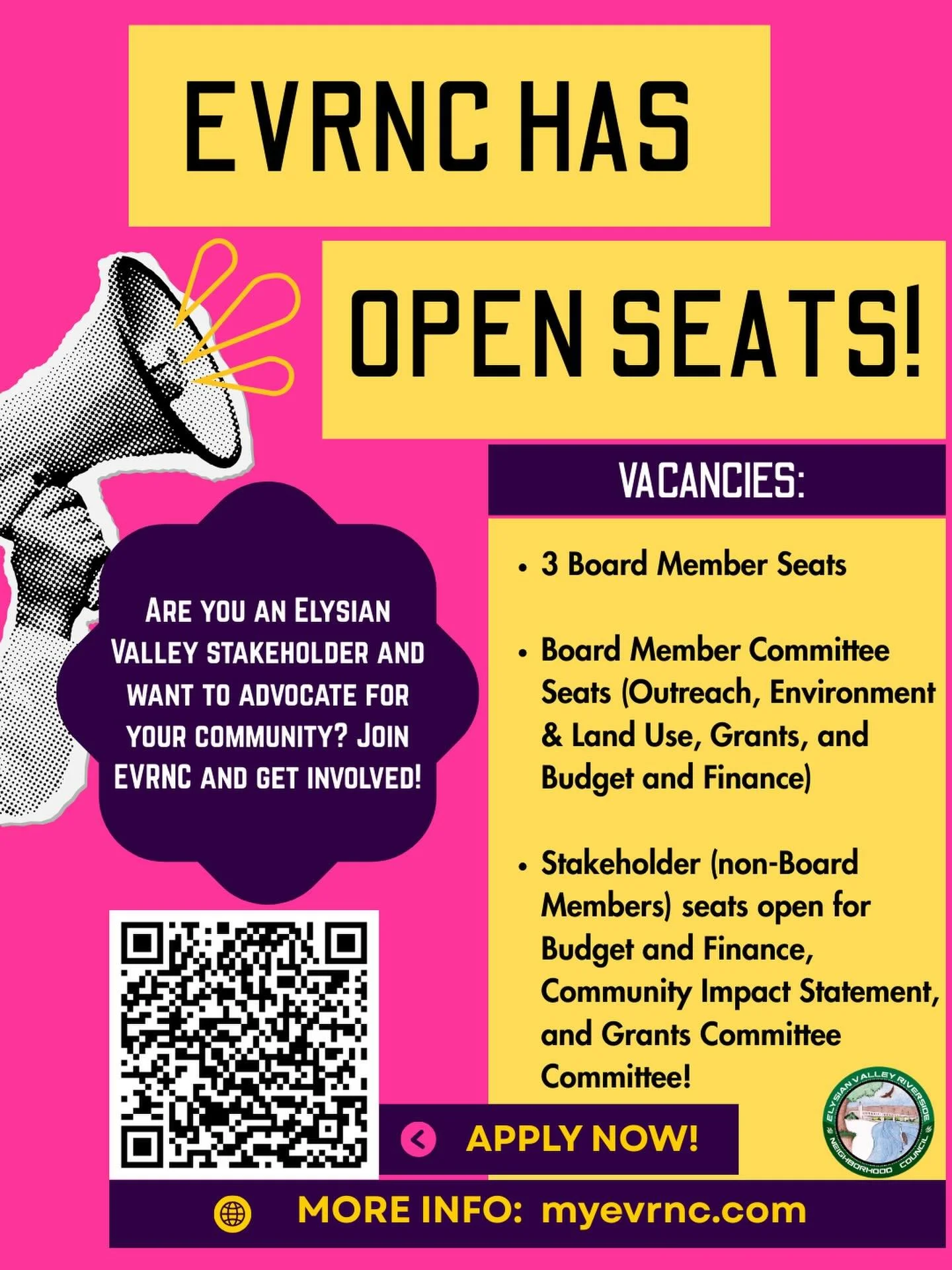 Attention Elysian Valley stakeholders: EVRNC has open board member and committee seats! Come advocate for your community and get involved. Apply here. Committee vacancies can be found on committee pages and board vacancies are always updated here.